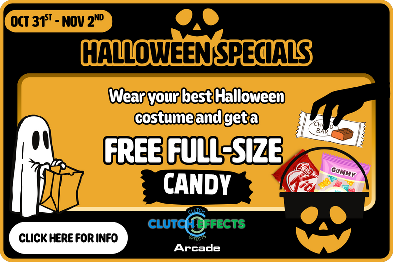 Starting on Halloween (Friday, October 31st) through November 2nd, all players who come to our Viejas Outlet Center location, are getting 30% Extra Play Credits, and 2 Plays on our Candy Crane Machines! In addition, on Halloween, we are giving everyone who comes in a Full Size Candy of their choice!!!