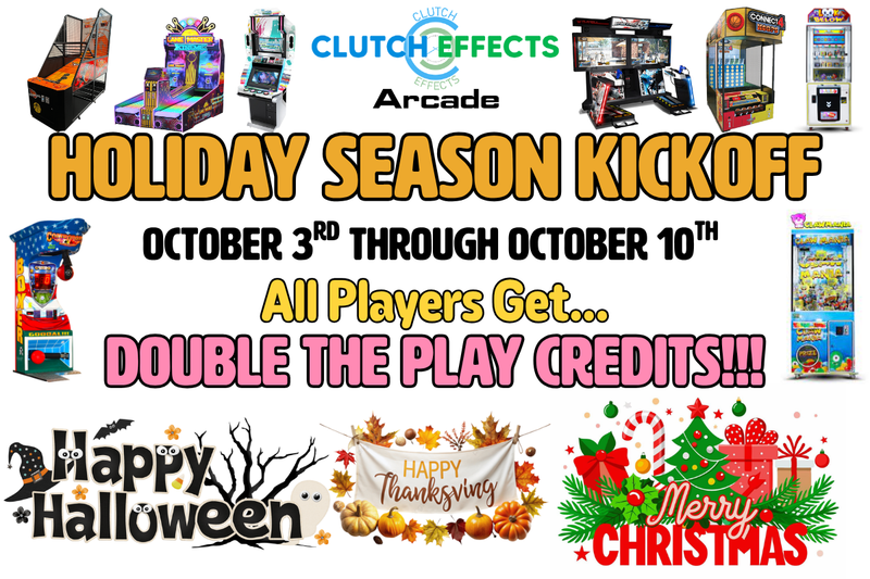 It's that time of year again, and we're Kicking Off the Holiday Season the only way that we know how! Between October 3rd and October 10th all players qualify for DOUBLE THE PLAY CREDITS! These play credits never expire, so this will be the time to stock up on your Holiday Fun!