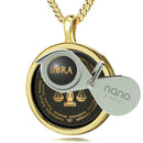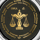 - Elegant Libra necklace inscribed in 24k gold with scale star sign surrounded by personality characteristics in intricate detail