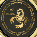 - Elegant Scorpio necklace inscribed in 24k gold with scorpion star sign surrounded by personality characteristics in intricate detail